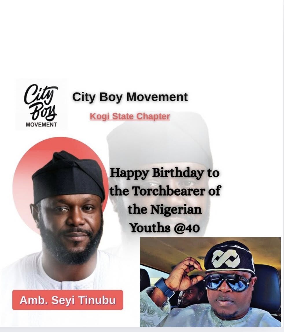 Abuja, October 9, 2025 — The City Boy Movement, Kogi State Chapter, has joined millions of Nigerians in celebrating the birthday of Ambassador Seyi Tinubu, describing him as a visionary young leader and true patriot whose commitment to youth empowerment continues to inspire a generation.